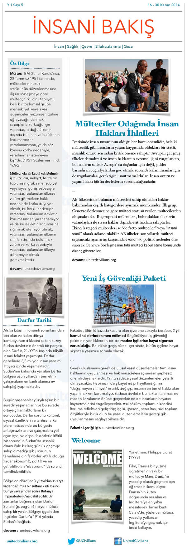 United Civilians (Birleşmiş Siviller)’in her 15 günde bir yayınladığı “İnsani Bakış” bülteninin 5. sayısı yayınlandı. Bültene kaydolmak için info(@)unitedcivilians.org adresine mail atmanız yeterlidir.